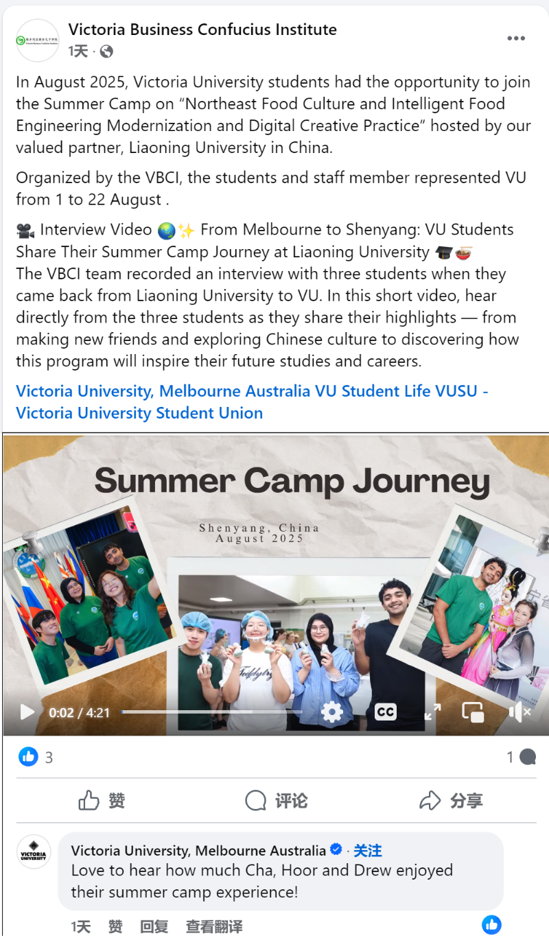 活动结束后,维多利亚大学孔子学院团队对三名从辽宁大学返回本校的学生进行了采访并录制视频。该视频由维多利亚大学孔子学院发布在Facebook和monthly e-newletter等外网平台。视频中,三位学生热情分享了夏令营的精彩亮点,从结交新朋友、探寻中国文化,到畅谈该项目对自身未来学习与职业发展的启发,无不洋溢着对此次经历的喜爱与收获满满的喜悦。同时,维多利亚大学官方也在外网对该视频点赞评论,表达了对Cha、Hoor和Drew等学生夏令营体验的欣喜,进一步提升了活动的关注度。