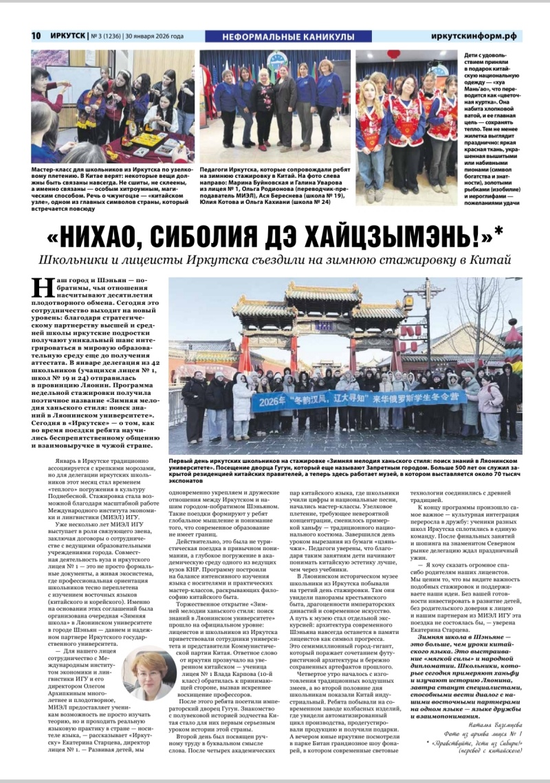 2026年1月30日,《伊尔库茨克周报》[刊号:№3(1236)](第10版)报道伊尔库茨克中学生赴我校参加冬令营项目,报道如下: